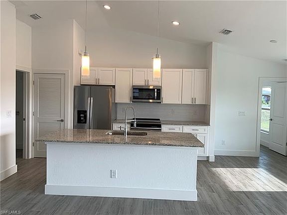 New Construction! This 3 bedroom, 2 bathroom plus den home is ready to move in. Tiles throughout the house with underlayment for crack prevention. Upgraded quartzite countertops in kitchen and bathroom. Kitchen with modern subway tile backsplash. All cabinets are engineered wood with dovetail drawers and soft close mechanisms. House comes equipped with lights and ceiling fans in living room and master bedroom. Stainless steel kitchen appliances (side-by-side refrigerator, range, dishwasher, microwave) and water softener to be installed day before closing. Master suite with tray ceiling in bedroom, two walk-in-closets and bathroom with dual sinks, shower and separate toilet. The house is located in a quiet neighborhood and is close to SR 82 and gives quick access to Ft Myers and I-75. Truly a perfect place to call home!