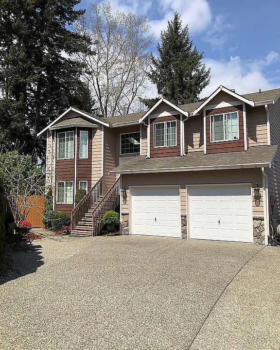 Hard to find, beautiful mother-in-law home in South Everett! TWO FULL LIVING SPACES! Located on a corner lot in a cul-de-sac. Beautiful mountain view. New paint. 4 bed + bonus room, 3 full baths, vaulted ceiling, skylights, 2 car garage, long private driveway, 2 decks, fenced back yard. Gas heat, stove, dryer, hot water. Gas fireplace. All appliances stay. Upstairs and downstairs have an open concept living/dining area. Great location. Close to Boeing, shopping, I-5, park-n-ride, lake.
