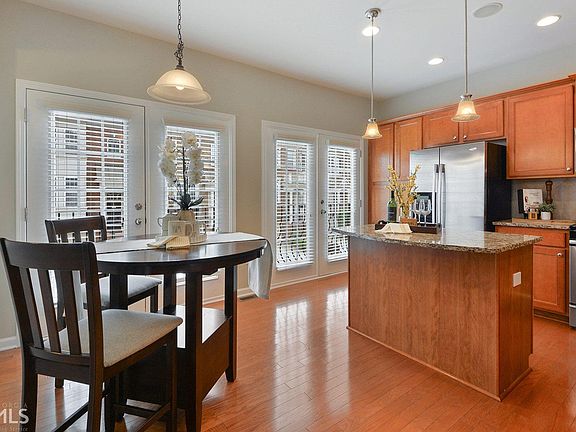 Stunning townhome in convenient Smyrna/Vinings! Just painted! Formal model home w/ lots of high-end upgrades & open concept living - hardwood floors, gourmet eat-in kitchen w/ granite counters & island, stainless appliances, built-in surround sound. Juliet balconies make it bright & airy. Luxurious master bath w/ his & hers vanities, garden tub w/sep shower & huge walk-in closet. Half bath on terrace level. Fenced yard backs up to woods. Deck off living room & pool great for entertaining. Best value in Vinings w/ low Cobb taxes. Fenced dog play area & active HOA.