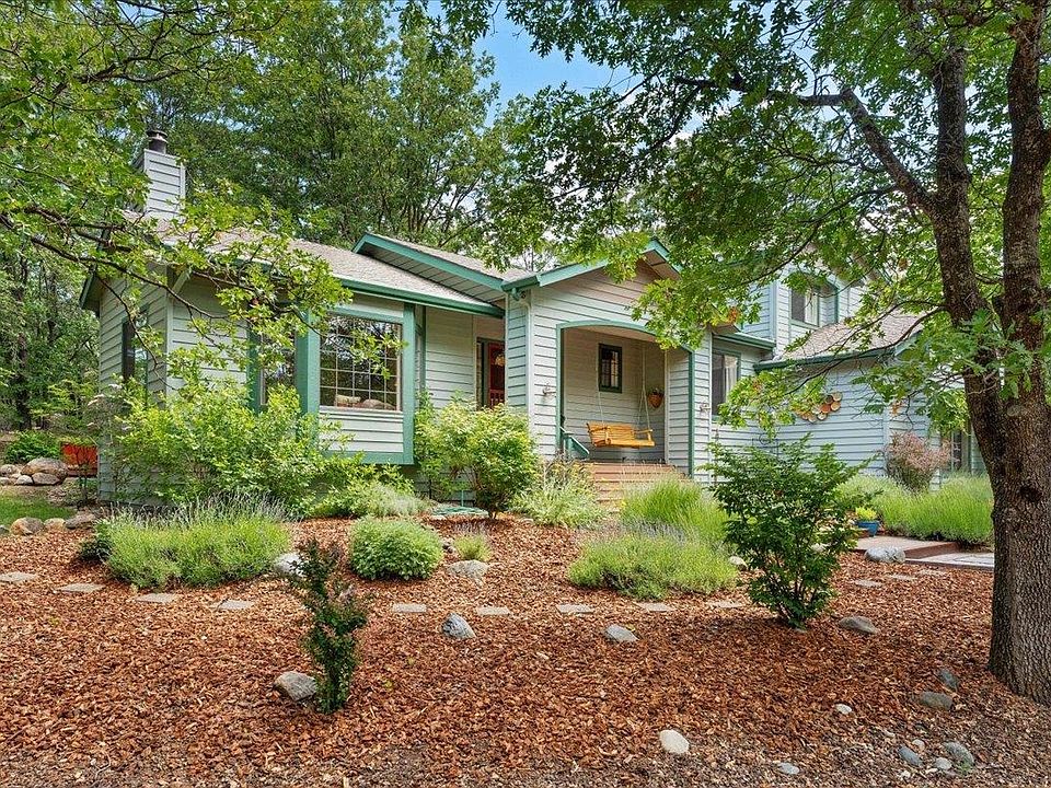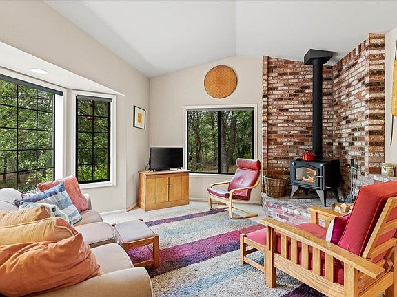 Here is a rare opportunity to own a lovely home and 13 acres! Located on 5.1 acres it adjoins a separate buildable 8-acre parcel. Enjoy privacy amidst oak trees that provide summer shade and winter light. The cozy living room features picture windows, a new wood-burning stove, brick hearth, and a vaulted ceiling. A large kitchen has an island and tile backsplashes. Granite counters and tile/hardwood floors accent the bathrooms. The primary bedroom showcases hardwood floors, electric fireplace, and walk-in closet. Another wood stove warms the den and art room with a sink, tiled backsplash and spacious storage. Other highlights include solar hot water panels, on-demand hot water, hot-water circulation pump, 10,000 watt enclosed generator, whole house fan, and surge protection. The three-car garage is used as an art studio, with upgraded electrical, LED lighting, heating, sink and ample natural light. Multiple decks overlook colorful, drip irrigated landscaping, raised beds and a fenced garden. In addition to a paved road, there are two storage buildings, one with a carport and wood storage. Enjoy the unique combination of solitude, proximity to services and outdoor opportunities!