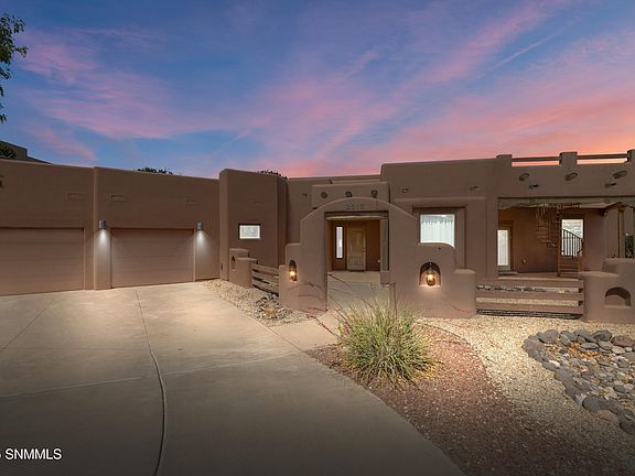 Discover Southwestern elegance at 2513 Twilight Ridge Way, a luxurious custom home in The Ridge at Northrise offering 3,494 sq ft of beautifully crafted living space. This adobe-style residence features authentic New Mexico charm with thick plastered walls, hand-carved vigas, wood corbels, granite counters, and custom cabinetry throughout. The spacious layout includes 5 bed, 3.5 bath, a 2-car oversize garage, a split floor plan, and a tranquil primary suite with dual walk-in closets. Enjoy the gourmet kitchen, two dining areas, a wet bar, and ceiling vigas that add character and warmth. Step into the front courtyard or ascend the wrought iron spiral staircase to the rooftop viewing deck forbreathtaking views of the Organ mountains and the Mesilla valley. Don't forget for peace of mind the new owner will receive a 1-year home warranty. This home is a rare gem--contact the listing broker today to schedule your showing now!