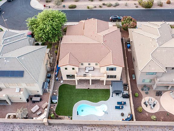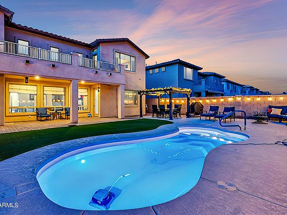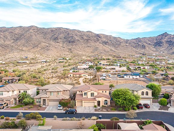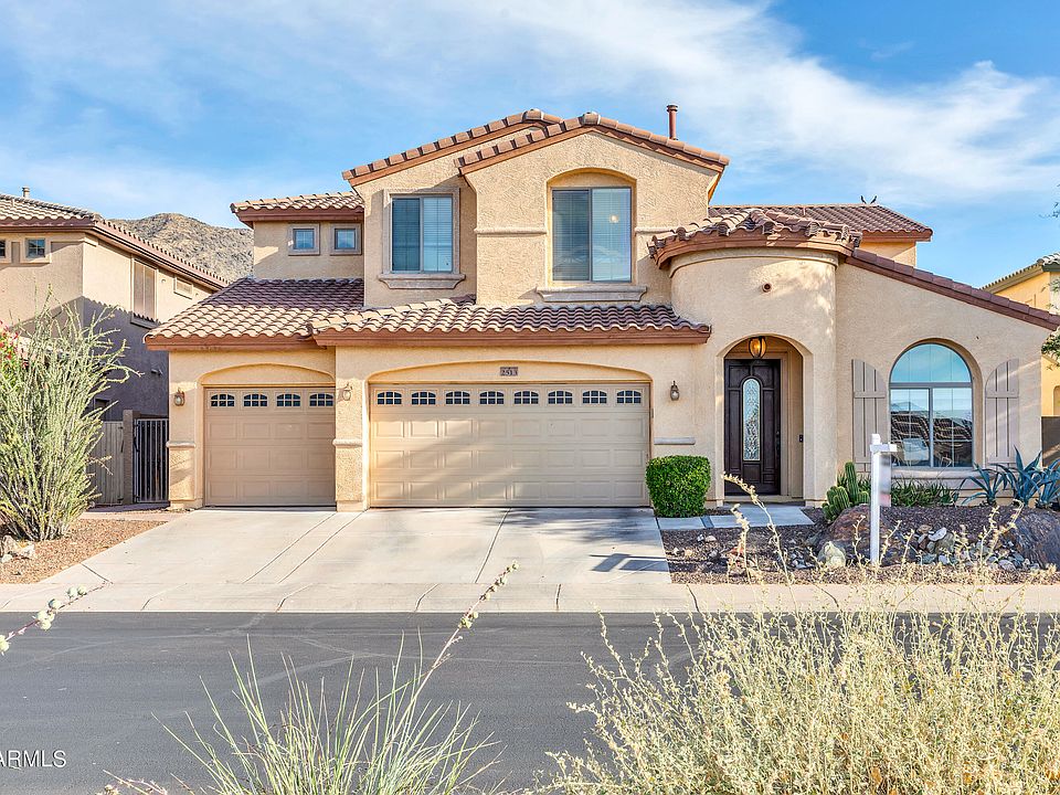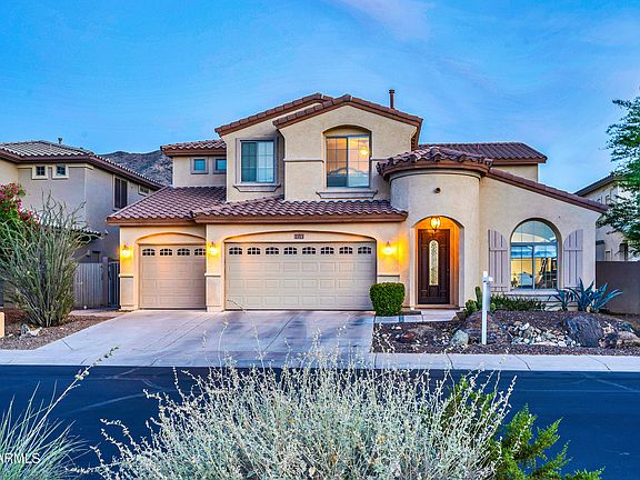 Discover this exquisite 4-bedroom home on a highly desirable N/S facing lot nestled in the gated community of Southern Highlands and surrounded by stunning mountain views. The open layout features large, flexible spaces that are both functional and energy-efficient including 19ft ceilings, a huge loft, and a separate bar area. The living area boasts a stone hearth fireplace, two-tone paint throughout, and tile floors with marble accents. The gourmet kitchen is a chef's dream with 42'' staggered cabinets, Corian countertops, a tiled backsplash, bar top seating, and double ovens. The master suite is conveniently located on the first floor, while the other three bedrooms and the loft with a balcony are upstairs. The master suite boasts a large jetted bathtub, double sinks, walk in shower, and huge walk in closet. Outside is a large covered patio, spacious grassy area of entirely synthetic grass, plus heated pool and spa. Just steps away from hiking and biking trails, with a short commute to downtown Phoenix, Sky Harbor Airport, I-17, and I-10. This home offers a perfect blend of luxury and convenience!
