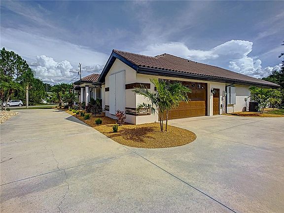 Perfectly Posh Paradise in Punta Gorda! Picturesquely located on a spacious 0.48-acre corner lot, this 3BR/3BA, 2,664 sqft home captivates the senses! Deep cocoa toned trim outlines the vanilla hued exterior, while the Spanish tile roof adds authenticity to the abode's architectural style. Towering palm trees, fresh landscaping, and an oversized circular driveway add to the immense curb appeal and thoughtful design. Completely renovated in 2020, the interior sparkles and dazzles with high-end materials and luxurious touches! Alluring and evocative of exotic travels, gleaming porcelain tiles run throughout the home, complementing the chic chandeliers and delicate light fixtures. Explore the brand-new, open-concept kitchen, featuring glamorous granite countertops, top-of-the-line stainless steel appliances, soft-close 48" custom cabinetry, breakfast bar, and a ceiling fan! Entertain guests in the living room with vaulted ceilings and accordion glass doors or opt to enjoy the outdoors by the screened-in pool and covered lanai! Find relaxation in the enormous master bedroom with a walk-in closet and an opulent en suite with dual vanities and a sumptuous rain shower! Other features: oversized 2-car garage, new interior/exterior paint, hurricane shutters, city water/sewer, private backyard, den with potential as bedroom, not in flood zone, separate laundry room, close to I-75, and so much more! Start Living the Good Life Today! Call now to schedule your private and exclusive tour!