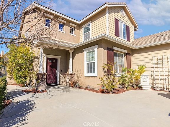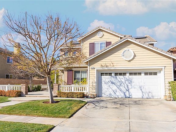 Stevenson Ranch 4 bedroom, 3 bath (one bedroom and bath downstairs), +loft, 2945 sq. Ft. pool home with a 3 car garage, and solar power, and QuietCool whole house attic fan. This home features a beautiful entry, where you will find a luxurious downstairs with formal living room, dining room, a spacious family room w/ wood mantle adorned fireplace, custom wood accent wall, wood floors and plantation shutters throughout . There is a downstairs bedroom and full bathroom, along with a separate laundry room nearest the direct access to the 3 car garage. The kitchen overlooks the family room, has ample counter top space with granite top, stainless steel type tile backsplash, a 4 burner gas cooktop, electric oven, microwave, and stainless steel refrigerator. Upstairs are 3 bedrooms, 2 baths, and a loft (bonus room) with french doors that pass through to a nice retreat that could be utilized as dressing room, or expanded closet . The primary bath has tile floors, a separate tub and shower, and walk-in closet, and primary bedroom is light and bright w/ views out to the backyard . This backyard is designed with relaxation in mind, and features a beautifully landscaped yard with a combination of grass and hardscape, a refreshing sparkling pool and spa, and room to enjoy a day in the sun with family and friends.