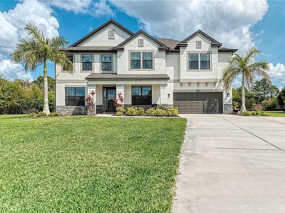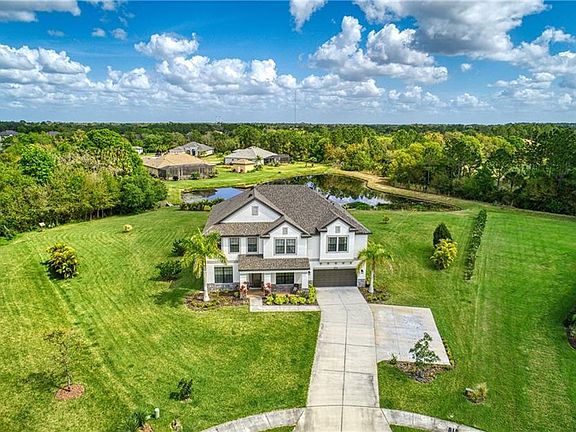 Price Improvement. **CLEANED AND SANITIZED BETWEEN EVERY SHOWING** Better than new! Stunning 5-bedroom custom home situated on an expansive .8-acre, cul-de-sac, view lot with plenty of distance and privacy between homes. Ideal multi-generational home with N0 CDD fees and NO mandatory memberships. Quality of design in floor plan and construction, with 4,924 square feet under air, inclusive of separate media and game rooms and multiple ensuite bedrooms. Attractive, wood plank tiling in main rooms, accented by soft grey tones and coffered ceilings. First level features include French doors to an ensuite flex room and bedroom with adjacent full bath. The brilliant kitchen features stainless appliances, quartz counters, double oven, designer cabinetry, mosaic glass backsplash, butler's pantry and an oversized 4-seat center island - perfect for seamless entertaining between kitchen and family room. Unwind each evening in the amazing spacious outdoor living area, your personal oasis with an enormous pool or dine al fresco within the covered lanai. There is a 3-car garage, plus 3-vehicle parking pad, allowing for ample parking options. Community amenities include a nearby playground, river access, fishing, canoeing, kayaking, dock and River House. Twin Rivers is a proud and friendly neighborhood of finer homes with an abundance of fresh air, space, peace and quiet. Minutes to shopping, restaurants and within an A+ school system. Do compare this opportunity with premium lot to new construction. Arguably the best value within Twin Rivers. Come tour today and prepare to be wowed!