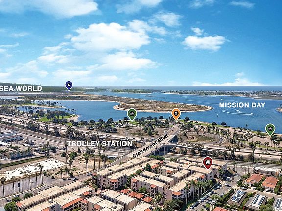 Live the ultimate coastal lifestyle in this beautifully located Bay Park condo at Costa Viva, where every day can feel like a vacation! This desirable 2BR/2BA single-level unit showcases sweeping views of Mission Bay through sliding doors that create walls of glass opening to a large covered balcony spanning the unit—perfect for morning coffee, al fresco dining, or front-row views of SeaWorld fireworks & SPECTACULAR SUNSETS. West-facing exposure fills the home with gorgeous afternoon light and refreshing coastal breezes, and as the sun begins to set, the sky & water come alive in a breathtaking show of color. Inside, neutral tones, spacious bedrooms, and the open-concept living and dining areas offer great flexibility to design your own coastal retreat. The kitchen features granite counters, a stainless sink, range and microwave, while laminate-style flooring with sound dampening enhances the bedrooms. Convenient in-unit laundry add to the home’s comfort. Offering EZ freeway access, elevators, the gated community features lush landscaping, 2 pools, 2 spas, and 2 parking spaces—one is covered & has storage. Walk, ride or roll to Mission Bay, beaches, dining, & shopping in minutes, or hop on the nearby Clairemont Blvd Blue Line Trolley for easy access to UCSD, UTC, Downtown, and beyond—plus avoid parking costs & challenges when the Padres are in town! Whether you’re heading out for a surf, paddle, or a ride on the bike path, FUN your way awaits! With HOA dues covering water & sewer, you can simply relax and enjoy Bay Park living, where every sunset feels like a celebration!