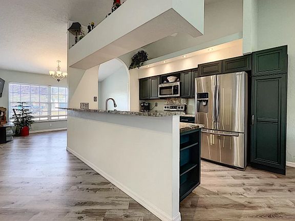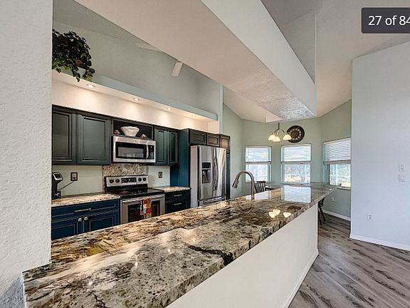 WELCOME HOME You've just found paradise. The interior with coastal inspired colors will bring in the warmth on the coolest days. Vaulted Ceilings, double door entry with lots of natural light pouring in through every room. Spacious open concept over looks the lanai & pool area with pocket sliders to bring the outdoors in,; extending your living space to the true Florida lifestyle.. Entertaining family and friends will be easy with the built in wet-bar that has custom marble counter, functioning sink & plenty of storage to accommodate any bartender. Luxury vinyl water proof flooring throughout the main space leaves no worries for wet feet, dog paws or spills. It's Life proof! Recently remodeled kitchen with lots of granite counters, custom wood cabinets and new stainless steel appliances. Invite your guests to gather round for there's plenty of space to sit and chat. Separate breakfast nook for morning coffee or family dinners. The primary bedroom has his and hers closets that lead into the master suite with elevated garden tub, dual sinks and walk in shower. The private entry out to the pool area is a plus. The split floorplan allows the other 2 bedrooms across the house sharing the guest / pool bath with tub/ shower combo. Covered lanai gives lots of space for entertaining, BBQing and splashing in your inground granite sports pool. Automatic pool cleaner included. There's even a screened, covered pool cage. Centrally located to all shopping,, restaurants, sports complex with 8 minute access to the Suncoast parkway. See it today!! *All bedrooms have since been updated with modern flooring instead of carpet* *Furniture not included with the rental*