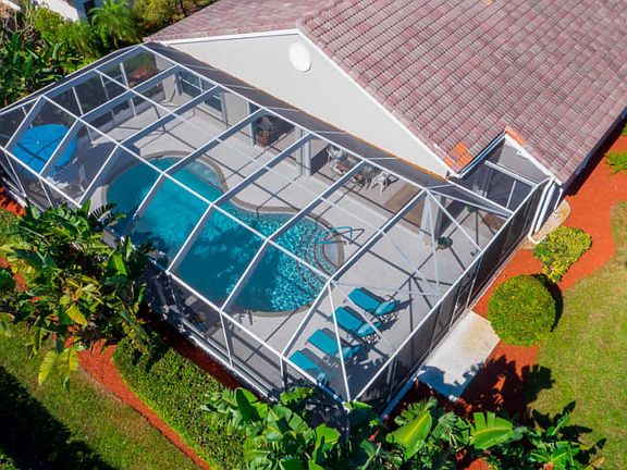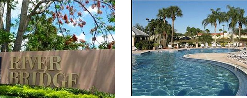 Magnificent 1 story pool home in the resort style community of River Bridge! This home has it all! Featuring 3 bedrooms, 2 baths, and a 2 car garage situated on an expansive corner lot. The eye catching curb appeal includes lush landscaping, a paver driveway and new paint which sets this home apart from the rest! Come inside and be greeted by soaring cathedral ceilings, gorgeous diagonal tile flooring and beautiful new paint throughout the spacious living areas. The inviting, eat-in kitchen with breakfast area and snack bar boasts gorgeous wood cabinetry with pullouts, quartz countertops and newer stainless steel appliances. The master suite in this lovely home is spacious offering a sitting area and his & her closets including a large walk-in. The master suite comes complete with a