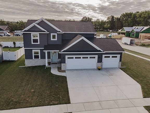 New Franke construction 2 story home with 4 bedrooms and 3.5 bathrooms. Modern farmhouse style home 4 Bed and 3.5 Baths and Fully Finished Basement. Limestone (grey) cabinets throughout, granite kitchen countertops, stainless steel appliances and hardwood flooring throughout the main level. Floorplan has a front flex room for dining or workspace with large walk in closet. Back hall drop zone has a locker system built in as well as a closet right off the kitchen. Family room is open to the kitchen and dining area. Master bedroom has a large bathroom with a tiled wall shower and double vanity and a walk in closet. Upstairs laundry room and a linen closet at the top of the stairs. Updates included whole house painted (2022) Wainscoting on Upper Level (2022), Sod (2022). Large Corner Lot, EV Charge Port and Gas Line in Garage. Don't Miss Out. Come See it Today!