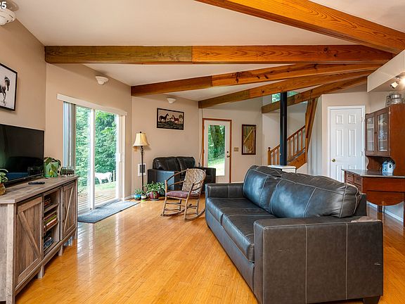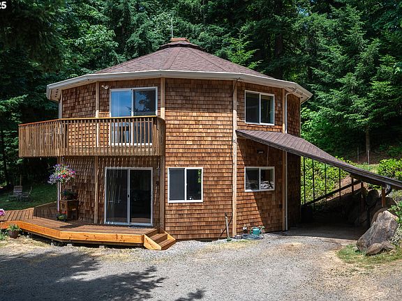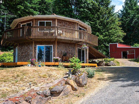 2032sf house & 925sf ADU... Beautiful 2-level cedar-shake sided Deltec round home on 6 acres of sloped pasture & timber. Adjacent to "protected" BLM land with direct access to trails, for riding, mtn biking, hiking, and more! The owner made great use of the topography creating a track system for her horses to utilize the wooded areas along with the pasture spaces. The home shines with bamboo floors and exposed beam ceilings, a remodeled kitchen with quartz, stainless steel and maple, spacious rooms, lots of storage, and plenty of wall space for furniture (it's not exactly round). Newly refinished deck on main level, and a Balcony with a View! Lose some trees on the lower acreage and see downtown PDX lights (as owners did originally). The well water is filtered by UV light, and again with a filter before entering the houses. The exterior includes a 1500 gal auto-filling cistern, and sprinklers on the roof, walls, deck and yard that soaks a large area in no time. Outbuildings on the upper acreage include a 2-stall barn with new roof & stall mats, tack room, water, power, loft and 6 ton++ hay storage, as well as a 40x42 equipment shed for cars, boat, trailer, RV storage, etc. You can drive thru and grab the barn compost pile to spread on the garden that graces the slope of the central pasture, complete with a make-shift greenhouse. MECHANICS DREAM a drive-thru workshop with 220amp power is on the lower acreage, along with the 2ND HOME - which is the original house on the property, a bonus with awesome potential for multi-family living or rental income, just needing some TLC. Mature Cherry, Apple, Pear & Plum trees. And don't miss the chicken house! Located at the end of Dianne Dr, off Upper Highland Rd, up on the butte (as they say, 1331ft elev.), behind a solar powered security gate, makes for private and serene living as you've only dreamed of. A diesel military generator and 3 cords of wood included (split, stacked, under cover & well seasoned).