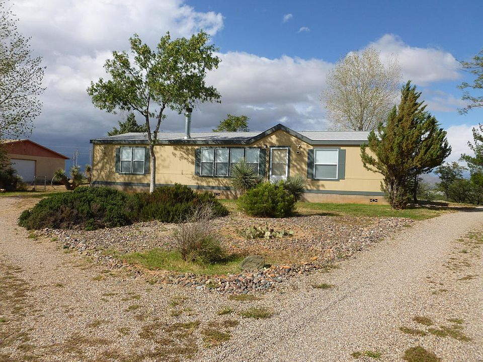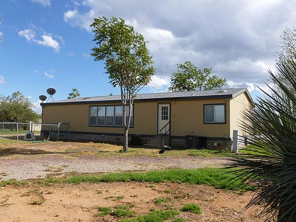 Manufactured, 3 bedroom, 2 bath family home on beautiful 1 acre; move in ready; fully fenced; circular driveway; various mature shade trees; private well #55-588684; New pressure tank in 2017; New A/C compressor 2018; New roof in 2016; New carpeting and exterior paint in 2017; fenced dog run; privacy; Mountain views; shed; quiet setting in the J-six subdivision of Benson. Vail School District.
