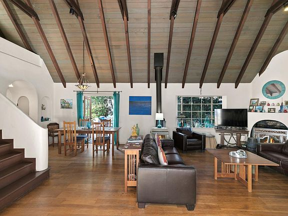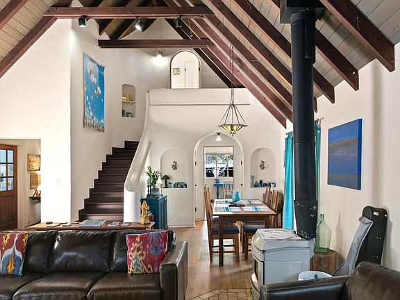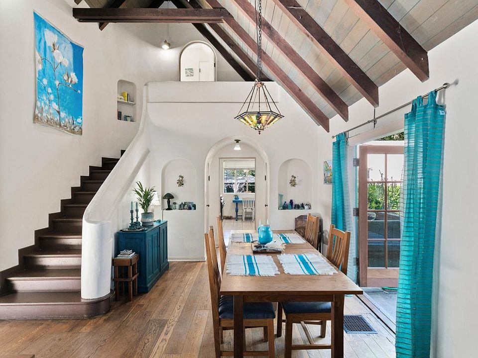 Quintessential Carmel charm can be found in this 2-bedroom 2 bath architectural delight where Cape Cod meets Spanish Revival. The open living space has a canopy of open beam cathedral peak ceilings and rounded doorways that give the room an warm, welcome, open feeling. The elegant curved stairway leads to a well-appointed upstairs bedroom with full bath that illuminates with natural light. Hardwood floors throughout and natural light cascading in every room upstairs and down. This self-contained .30 plus acre parcel boasts fabulous front and back outdoor living spaces and is walking distance to Carmel High School. Having been a long-term rental this home needs a little TLC, but is in the perfect location to live or invest.
