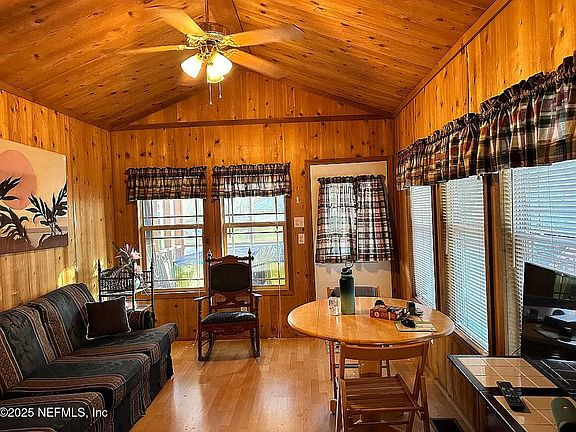 Discover this delightful 2-bedroom, 1-bathroom mobile home, built in 2006, nestled within the gated Salt Springs Resort on the serene Little Lake Kerr. Featuring rustic log cabin-style siding and interiors, this cozy retreat offers tranquil lake views from the front porch, perfect for unwinding after a day of outdoor adventures.