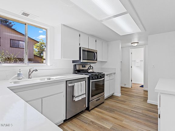 Welcome to the most affordable 3 bedroom townhome in Flagstaff. Check out this newly remodeled end unit! New flooring, fresh paint, new countertops, new appliances, new plumbing fixtures, new window coverings and some new light fixtures. Other upgrades include a new sliding glass door, new screen door, removal of half wall in entry to open up living room and all the popcorn ceilings removed! New shower, toilets and more! Great floor plan with vaulted ceiling. Very versatile property can be used as a primary residence, second home or a long or short term rental (buyer to verify). Fenced backyard. Cute front yard with apple tree. Affordable HOA. Centrally located in Flagstaff with nearby shopping, healthcare and restaurants. 2 car garage. Seller is licensed Realtor. Don't miss this one!