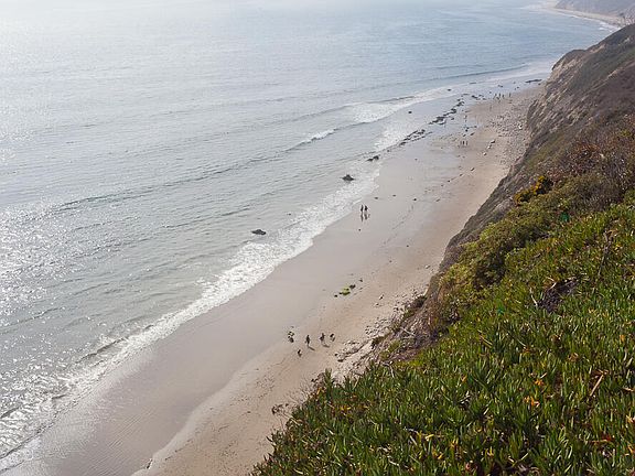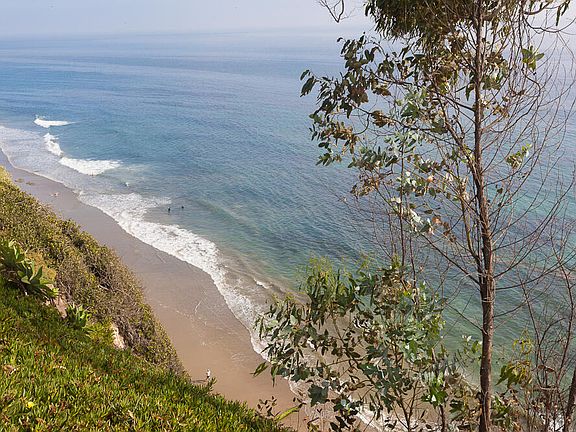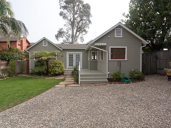 This beautiful bluff-top, ocean front home is located down a private drive and is filled with sunshine & Ocean views. This is a true Mesa original. One of the first bluff-top homes built in this zip code. Stunning views can be seen from most rooms. There is a newly built large back porch looking out to the water. Studded with eucalyptus trees, this single level property has 3 bedrooms, 1 bathroom and a fireplace. Beautiful hardwoods in most of the rooms With the Douglas Family Preserve (a dog friendly park) just moments away. Property has just received a fresh paint job inside & out. New deck & landscaping, parking gravel, carpet in one bedroom & all new window coverings. A new refrigerator is included. Washer & Dryer hook ups. No garage. Uncovered parking for 4 easily