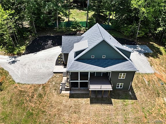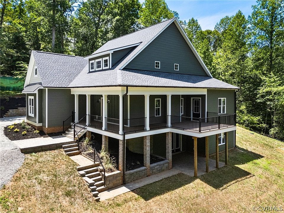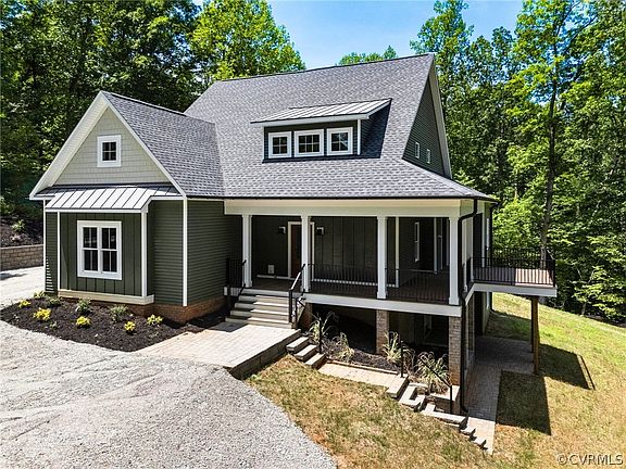 One of a kind home and lot just hit the market! This secluded, brand new home in eastern Powhatan has something to offer EVERYONE! As soon as your tires leave the hard surface road and enter the driveway your excitement and adventure begins. The home sits high on a hilltop overlooking a creek and the old Mill down below. The covered, wrap around porch is perfect for both watching nature and entertaining. Inside the beautiful hardwood floors and custom Craftsman trim and details will instantly grab your attention. The great room features a stone, gas fireplace, coffered ceiling and enough space for all the family to gather. The kitchen will please any chef with it's soft close custom cabinetry, MASSIVE island with sink, dishwasher and barstool seating, stainless appliances with gas range, tile back splash, stainless range hood and granite countertops. Open to the kitchen and living room, the dinning area will handle a massive table and flows right out to the deck for expanded outdoor dinning possibilities. The 1st level primary suite will comfortably house even the largest of bedroom furniture and features a luxurious bath with soaking tub, tile walk in shower, double vanity and private toilet room. Level 1 is also home to the laundry room, custom built in hall tree, powder room and garage entry. Upstairs is a large loft area with enough room for just about any set up/configuration imaginable, bedroom with 2 closets and connected gaming room/study, 2 moore large bedrooms and full bath with double vanity and separate shower/toilet room. The basement would make and incredible den/movie theater/hobby area/additional bedrooms....the possibilities are literally endless.There is a full bathroom and huge storage closet as well as French doors leeding to the covered paver patio for even moore outdoor living space. Come see this amazing new construction today, you just might call it home after your visit.