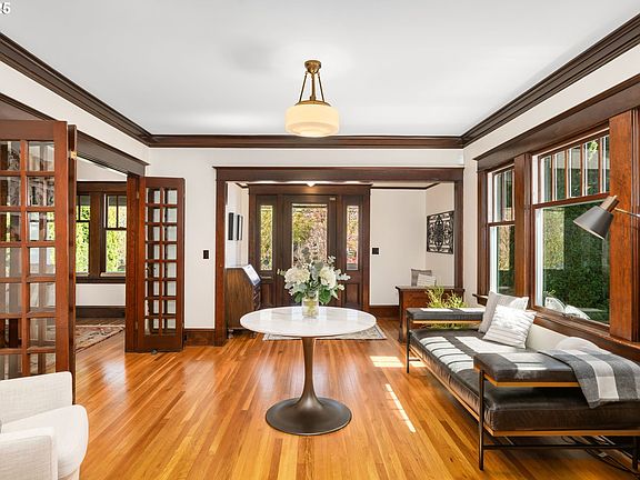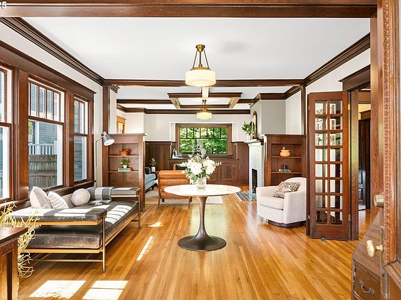 Timeless and elegant craftsman foursquare in the heart of Grant Park/Historic Irvington exudes comfort & charm. Original milled woodwork, includes entry way bench, built-in buffet, box beams,crown moldings, french doors and recently refinished wood floors throughout the main and 2nd floor. Practical organization of space and flow includes six large bedrooms, five above ground one in the lower level and a bathroom on each of the four levels. The quiet and serene escape, newly carpeted and updated third floor primary suite, features an elegant shower and roomy walk-in and around closet. Clear vertical grain fir trim throughout enhances the updated large basement creating a warm and welcoming entertainment/family room, the sixth bedroom, a full bathroom, laundry room and ample built-in storage. The basement has an independent entrance on the north side of the house. Central air, 95% efficiency furnace, on-demand water heater, earthquake retrofitting, double-pane glass wooden framed windows for efficiency and a transferable roof warranty for peace of mind. [Home Energy Score = 1. HES Report at https://rpt.greenbuildingregistry.com/hes/OR10209631]