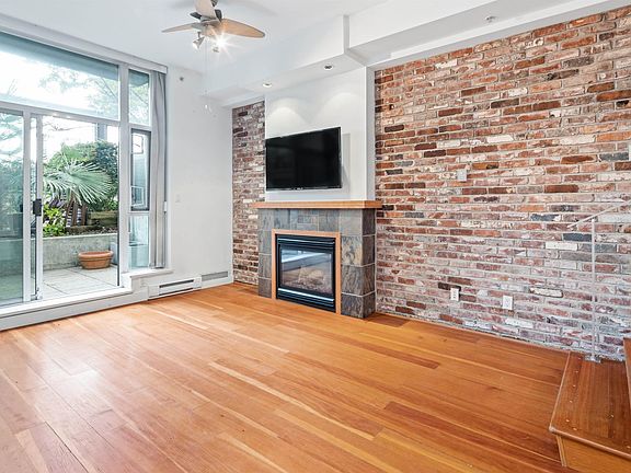The perfect 1 bedroom loft-like home nestled in the heart of Mount Pleasant at the Elements building. Backing on to calm, tree-lined streets and bicycle paths, the beauty of its surroundings are brought inside with a feature brick wall, high ceilings and warm hardwood flooring. Oversized windows bring in the lush exterior gardens to enjoy in the spacious dining and living areas. Natural gas fireplace makes for cozy evenings & the open layout encourages entertaining. Large patio facing into lush, inner courtyard (2 levels above ground). 1 parking stall and 1 storage locker are included. Pets & rentals are welcomed. Investment value is evident with the upcoming broadway & Main St skytrain station. Open House Saturday, December 3rd 12:00pm - 1:00pm & Sunday December 4th, 12:00 - 2:00pm.