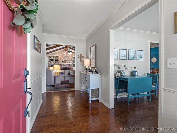 Welcome to this beautifully updated home in a prime location, perfect for comfortable living and entertaining! Step into the formal living and dining rooms featuring engineered wood flooring and a new Low E picture window, filling the space with natural light. The remodeled kitchen is a chef’s dream, boasting new stainless steel appliances, Corian countertops, and tile flooring. Loads of work space & storage space including a pantry. Enjoy cozy evenings in the den, complete with vaulted beamed ceilings, a wood-burning fireplace with gas logs and a charming coffee bar with a granite countertop. The primary suite offers a remodeled bathroom with luxurious granite and travertine tile finishes. Additional updates include a new hot water heater (2021) and HVAC system (2016), ensuring modern efficiency and peace of mind. Outside, relax or entertain on the fully fenced yard with both covered and uncovered patio areas. Practical amenities include a storm shelter and sprinkler system for added convenience. Located in the sought-after Wayside Elementary school district, this home is a must-see!
