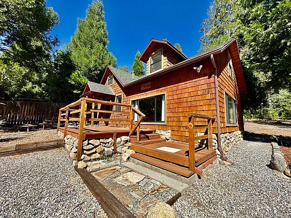 Nestled down a quiet mountain road, this unique, circa 1940 cabin has been improved throught the years offering a blend of knotty pine interior and drywall - giving it a modern feel to old charm. Sitting on .48 acre of all usable land, this cabin offers a cozy living room with propane freestanding stove, step down to a large primary bedroom with fireplace and wood stove insert. Off the bedroom is a full bath, W/D hookups and leads to the breakfast nook in the nicely appointed, wrap around kitchen. A door leads to the expanded back deck and patio, with an enchanting bridge leading to the spacious backyard with ridgeline mountain views and a workshop. Original stairs lead to the additional sleeping areas - the 2nd and 3rd bedrooms, an office area and convenient 1/2 bath. Lovingly maintained and enhanced, this cabin amid the pines is waiting for you!