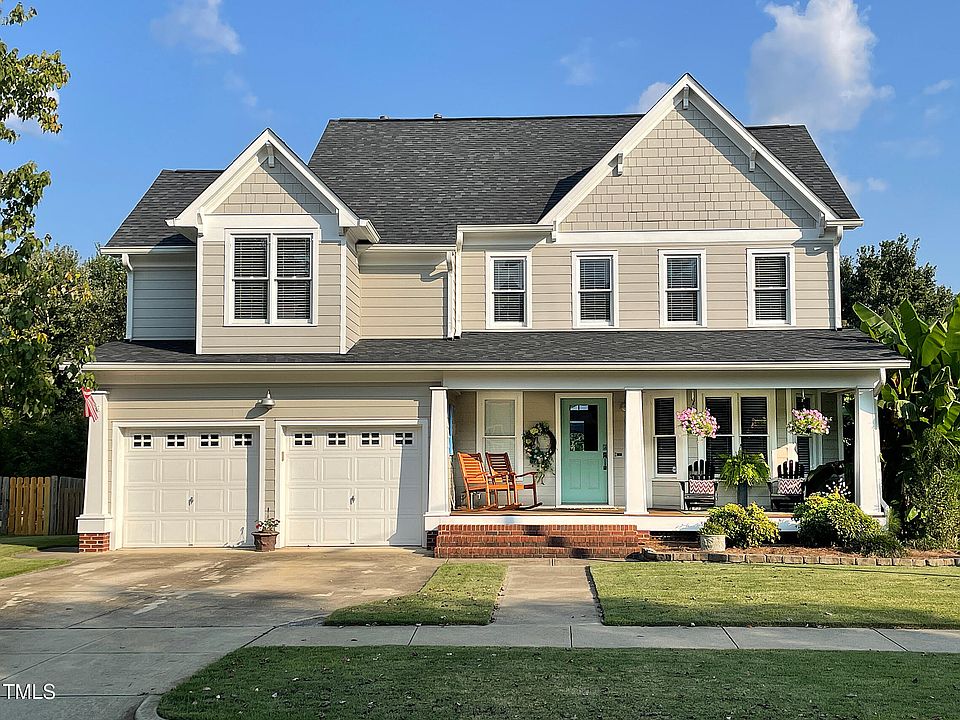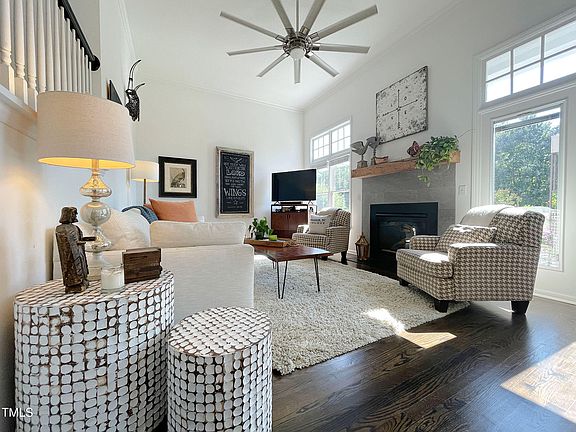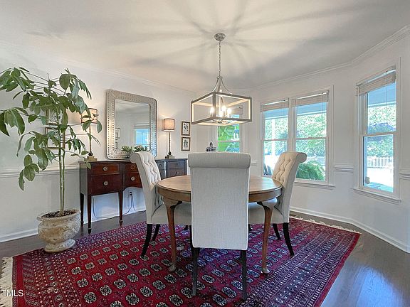 Rare find--Beautifully updated Craftsman home with bright open floorplan that backs up to picturesque and serene BRIGHTHAVEN PARK! Charming covered rocking chair front porch! Hardwoods in all living areas and bedrooms! Wonderfully landscaped .24 acre lot with fenced backyard, firepit and garden area. Dining room with hardwoods, crown molding, chairrail and bay alcove. Spacious Dramatic Family room with soaring 12'' ceiling, hardwoods, fireplace with rustic beam mantel and ceiling fan. Sunny Kitchen with large center island with breakfast bar, hardwoods, Carrara marble countertops, stainless appliances, gas range, range hood, tile backsplash and pantry. Huge Primary bedroom with vaulted ceiling and walk-in closet Light-filled Primary Bath has dual vanity with Carrara marble countertop, tile floor, soaking tub, separate shower and vaulted ceiling. Secondary bedrooms with hardwoods and ceiling fans. Bonus/4th bedroom with hardwoods and ceiling fan. Oversized deck with amazing view is great for entertaining! Falls River's Greenway Swim and Tennis Club is available for membership. Close to shopping, great restaurants, Falls Lake and I-540!