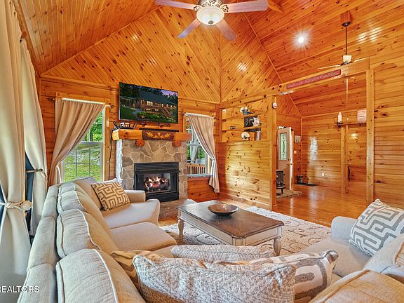 Escape to your very own Smoky Mountain retreat with this stunning 3-bedroom, 3-bathroom true log cabin offering over 3,700 sq ft of living space on nearly 2 private acres! Recently stained in 2023, this home is full of charm and craftsmanship from top to bottom. The open floor plan welcomes you with soaring ceilings, pine wood floors, and a gorgeous gas log fireplace as the centerpiece of the main living area. The chef's kitchen features a large island, new stainless steel appliances, and plenty of space for entertaining.