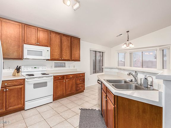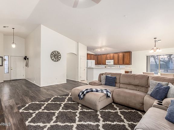 This charming Mesquite Groves Community home has had some remodeling done, with a welcoming open floor plan and vaulted ceilings. There is luxury vinyl flooring in the common areas and fresh carpet in the bedrooms. The spacious kitchen has wood cabinets with a breakfast bar. The master en suite has plenty of space bathroom has double his and her sinks with a walk-in closet! Entertain guest in the backyard with a covered patio, sparkling pool and turf area. There is also a bonus room that can be converted into a bedroom. This makes for an incredible family home! The SOLAR panels are OWNED and paid off.