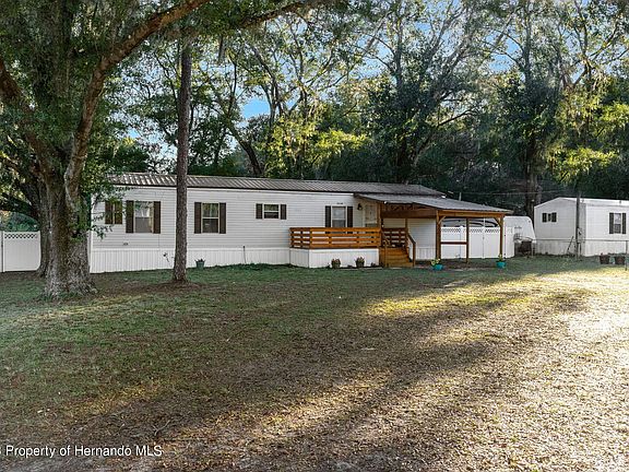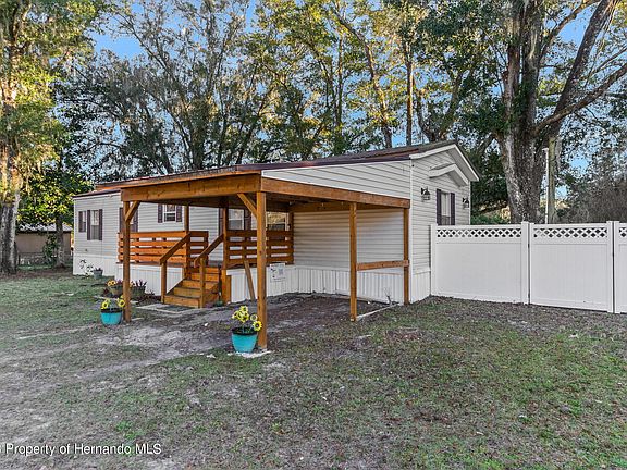 Check out this 2-bedroom, 2-bathroom mobile home on just over half an acre of land in a quiet neighborhood in Brooksville! Spacious backyard for your pets, toys, a garden or even a pool! This home features a split floor plan with NEW water-proof vinyl flooring throughout the home, an open kitchen, and an indoor laundry room with a doggy-door leading to the backyard for your furry friends. All the appliances, including the washer and dryer stay with the house! Ceiling fans throughout the home. The master bedroom has 2 walk-in closets. The HVAC unit is BRAND NEW (Installed December 2022). New front deck and carport that is nicely stained and will last! New vinyl privacy fence along the front of the house with double-gated access on each side. RV hookup on site just behind the privacy fence. Additional metal carport in the backyard; currently has kennel fencing around it that stays with the property but can easily be moved to allow for boat or car parking. The property is fully fenced all the way around with TWO gates in the front for a circular driveway. Did I mention the best part? Bystre Lake is only MINUTES away and can be viewed from the kitchen window! This public lake offers a great place to escape after a long workday. The boat launch is just at the end of the street. This property is less than 10 minutes from shopping and downtown Brooksville. Call your realtor today to schedule a showing!