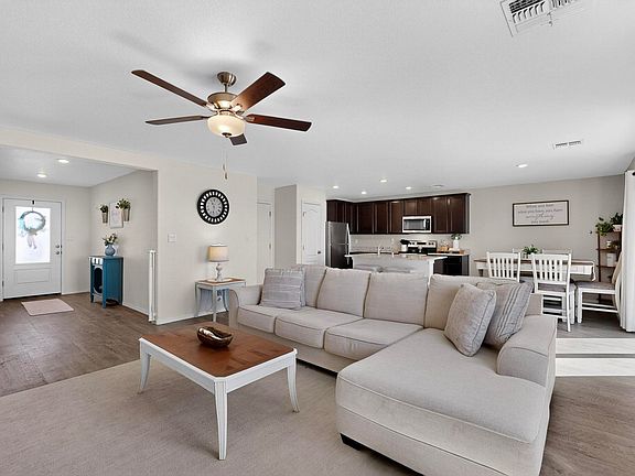 Fully landscaped yard! Welcome Home to this Jemez floorplan by LGI, offering a single story design, with 3 generously sized bedrooms & 2 baths. The open layout is perfect for modern living, with a spacious family room anchored by a well-appointed kitchen showcasing rich cabinetry, granite countertops, stainless steel appliances & a large island that overlooks the living/dining areas, making entertaining a breeze. The primary suite features a generous closet & en‑suite bath. Outdoors, this home truly shines! The fully block-walled yard boasts synthetic turf, a paver patio & fire pit, plus a gravel play space, all finished & ready for gatherings. Easy maintenance, desert landscaped front yard. Located in a growing community near schools, shopping, & commuter routes.