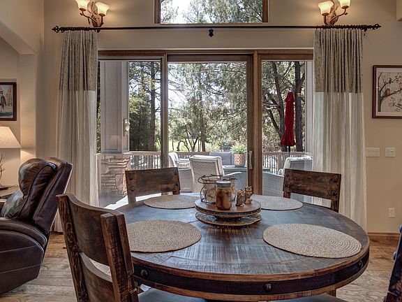 Enchanting Golf Course Views in the Tall Ponderosa Pines! Beautiful rustic Mountain home w/ views out every window. Enjoy Viewing golf hole #18 after a day of golf as you sit on your amazing ''New'' massive Forest view Trex deck accentuated with Telluride Stone. BBQ steaks while your family plays horseshoes. Only a 5 minute walk to the Clubhouse & Golf Practice Facilities, Range & locker rooms and indoor/outdoor Restaurant! Engineered wood floors,stain pkg, knotty Alder cabinets & doors, Pella doors & windows, 2 master bedroom suites, split, main level. 3rd bedroom & bath in loft. Epoxy garage. End of gorgeous cul-de-sac . Year round golf. Adjacent to 8 mi. hiking path.Some furniture and golf cart available by separate agreement.Membership req.