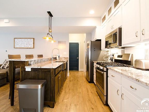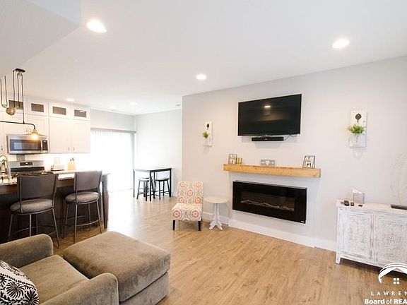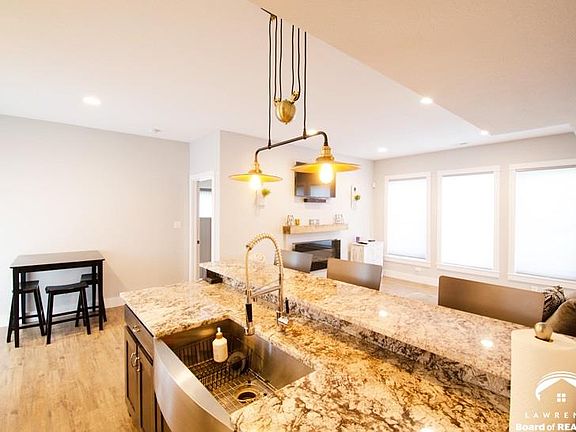 2 Living areas! Master Suite on the main level! Kitchen has granite counters, custom cabinetry soft close drawers and roll-outs, under cabinet lights, 5 burner gas stove and pantry with roll outs. Lots of extras and Lots of storage! Established yard with two patios and a Sprinkler System! Energy Efficient! Hard surface flooring throughout is durable and easy to clean. Easy access to the South Lawrence Trafficway. This is not your typical builder finishes.