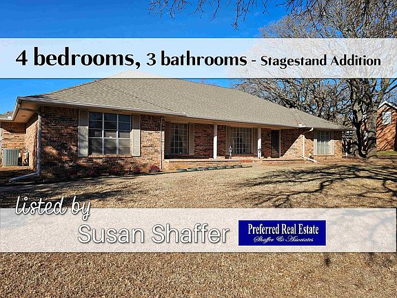 This 4 bedroom home at 2517 Stagestand is nestled at the grand entrance of the Stagestand Addition in Duncan. It provides a mother-in-law floor plan with two spacious living areas. The primary bedroom has a full bathroom, the second bedroom has a 3/4 bathroom. The third and fourth bedroom are next to a spacious hall bathroom. There are three hall storage spaces. The front formal living host a formal dining space and the kitchen has family dining. You can cozy up in the family room while enjoying the backyard view. The driveway extends around to the back of the house for garage parking and basketball tossing. Formerly there was an in-ground pool that has been filled in and it creates an attractive backyard setting. The LISTING REALTOR is Susan Shaffer with Preferred Real Estate in Duncan Call 580-251-0618 for a viewing.