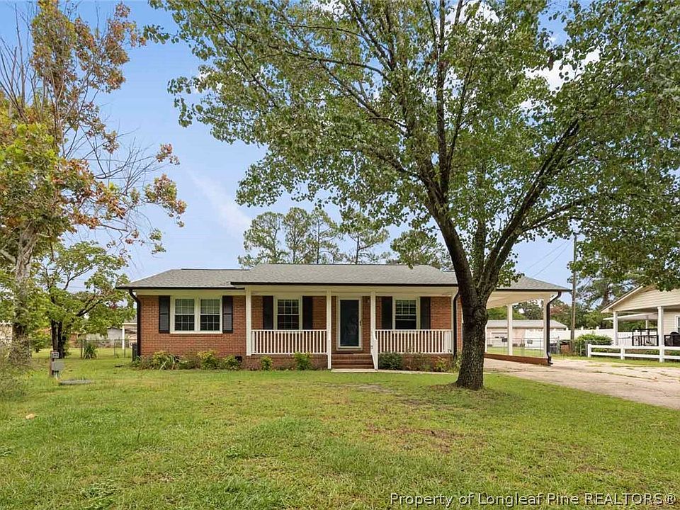 Home! Large Multi vehicle garage for all of your toys with a separate tool shed. Home has hardwood floors in the living room, hallway, and bedrooms. Primary Bedroom has a 1/2 bath with access to the laundry room and kitchen. There is potential to add a shower to Primary bathroom area. Eat-in kitchen creates a family atmosphere. Covered front porch and large covered deck on the back with a well manicured fenced yard. Home is located across from beautiful wooded area and is conveniently located near the airport, shopping, and our Crowne Arena where you can enjoy live sports and concerts. Location allows for easy access to Ft Bragg and I95. Roof and septic are all less then 5 years old. Home sits on approximately 0.53 acres. Covered single car carport with storage unit. Get it before it is Gone!