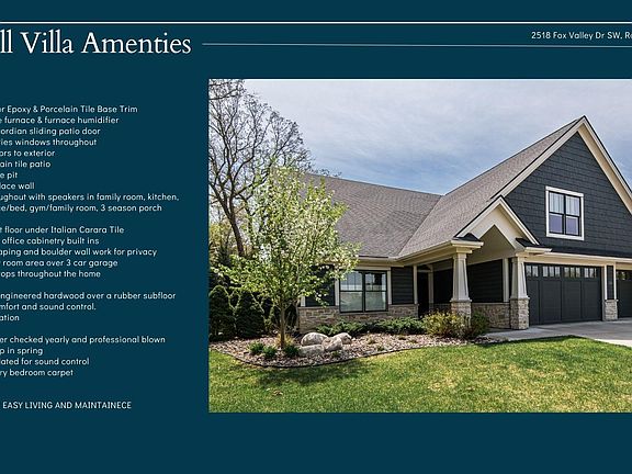 Exquisite home in a coveted location! This residence exudes luxury! Soaring 2nd story features, highlighted by a primary suite on the main floor, this home provides everyday convenience and ultimate privacy. The primary ensuite boasts Italian Cara tile & heated floors, creating a spa-like retreat. The bedroom is complemented by brand new carpeting for warmth & comfort. Impressive 10ft x 18ft Marvin Accordion sliding patio door opens to the covered & screened porch, overlooking the 175ft boulder privacy wall and mature landscaping. Relax & entertain on the expansive 1,000ft porcelain tile patio featuring built-in gas fire pit, grilling station & grill. Cambria countertops, custom cabinets grace every space, exuding elegance & luxury. Custom stained engineered wood floors add a timeless beauty. The second floor offers a loft w/a large gym or family room, two additional bedrooms, and a bathroom. Lawn maintenance, snow removal, and waste disposal services are included in HOA.