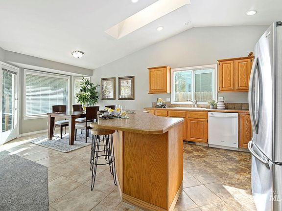 Welcome home to a charming single level cottage located in a quiet cul-de-sac in the heart of Meridian. This well-maintained home features a spacious tiled entry. Options for use are numerous. Large windows provide natural light and views of the yard. Vaulted ceilings add to the open floor plan, which includes new carpet and paint. Meadowglen features a primary suite, two additional bedrooms, laundry room, large dining area and plenty of storage. Enjoy the open kitchen with plenty of counter space and island for entertainment. The yard is fully fenced and includes a storage shed for gardening tools and outdoor equipment. Close to shopping, schools and parks.