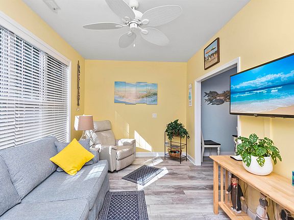 Stunning 2 bedroom 2 bath home. Ease care vinyl plank flooring throughout the entire home. This home has been completely renovated throughout. Ceiling fans in every room, 3 wall mmounted televisions that are included. Homas has been completely painted every room ready for move in. Has a complete irrigation system to keep your lawn in great shape. 1 car attached garage and over garage storage. All kitchen appliances have been replaced with stailess steel finish. Washer and dryer included with purchase. New metal roof installed 9 years ago with a 40 year warrantly. This property is located in Woodlake Village, a 55 and over community with low HOA fees. 2 miles from beach.
