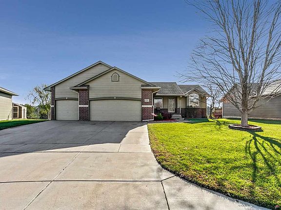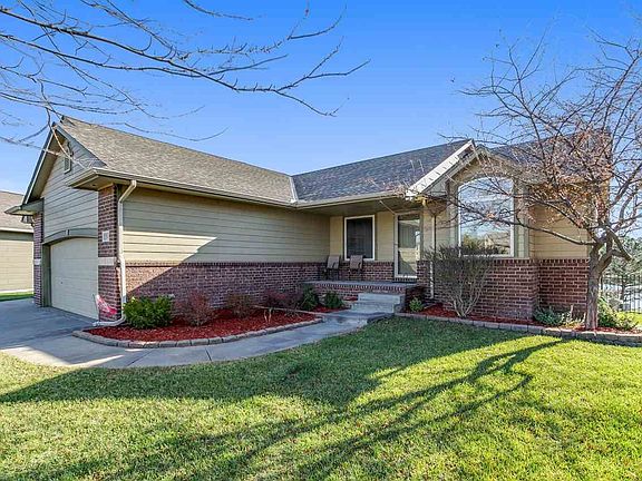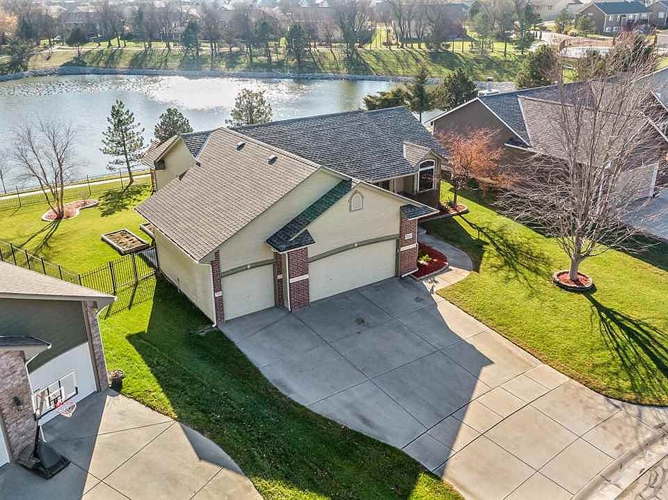 Welcome home to this beautiful West Wichita residence! As you walk in, you will find a floor to ceiling gas fireplace and gorgeous water views. The 4 bedroom, 3 bath home boasts an open floor plan, vaulted ceilings, and a three-car garage with plenty of built-in shelving for storage. The kitchen has beautiful Corian countertops, an eating bar, pantry, and a built-in desk. The split bedroom plan offers privacy for the master suite. You will find some things in the master: the incredible views, his and her closets, and a well spacious master bath with tall vanity, two sinks, dual shower heads in the walk-in shower, and a separate tub. Two more bedrooms and a bathroom complete the main level. Downstairs the view-out basement offers a huge family and rec room, a wet bar with a mini-fridge, a third bathroom, a fourth bedroom, and storage. The garage is insulated and waferboarded walls. Outside you will find gorgeous landscaping, stunning water views, a sprinkler system and irrigation well, and an oversized deck. Talk about location.. this home is within walking distance of the newly remodeled neighborhood pool, playground, and tennis court.