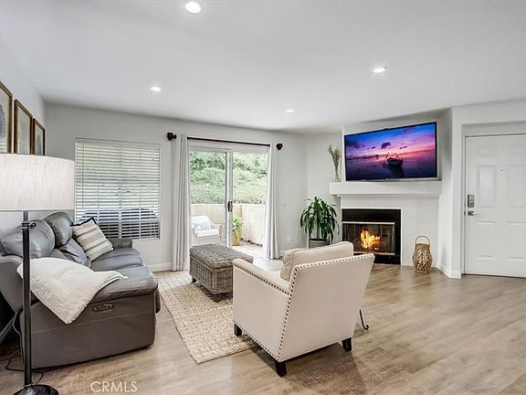 Beautifully remodeled, this Del Prado condo is truly turnkey! Warm vinyl wood floors, recessed lighting and custom finishes throughout complement the bright and open floorplan. Enter into the inviting living room featuring a cozy fireplace and sliding doors to the back patio that seamlessly flows to the dining area and to the kitchen. The kitchen is upgraded with fresh white cabinets, quartz counters, subway tile backsplash and stainless steel appliances. Down the hall, the primary bedroom offers light-catching sliding doors to the back patio and an en-suite primary bathroom with a quartz topped vanity with dual sinks and a walk-in shower with decorative tile. The secondary bedroom is generously sized, features a shiplap wall and is adjacent to the full hall bathroom. Additional features include a brand new HVAC, newer water heater and direct-access to the two-car garage with convenient laundry hook ups. Relax in the spacious back patio featuring low-maintenance artificial grass. Enjoy the nearby community pool, spa and playground. Located near shopping and dining options, easy freeway and toll road access and award-winning schools!