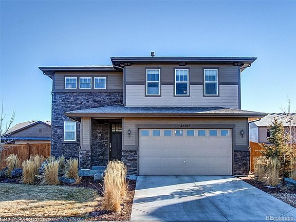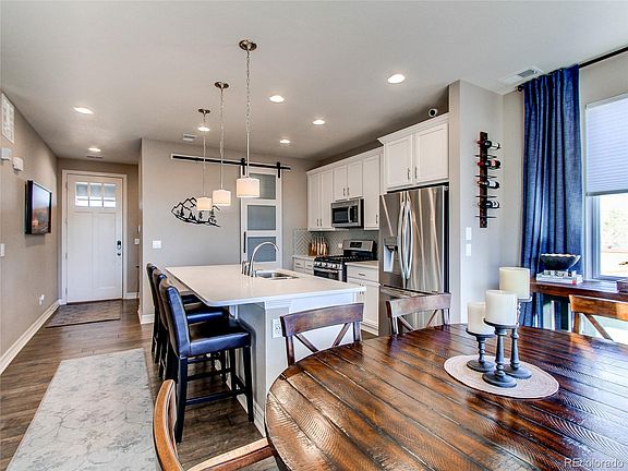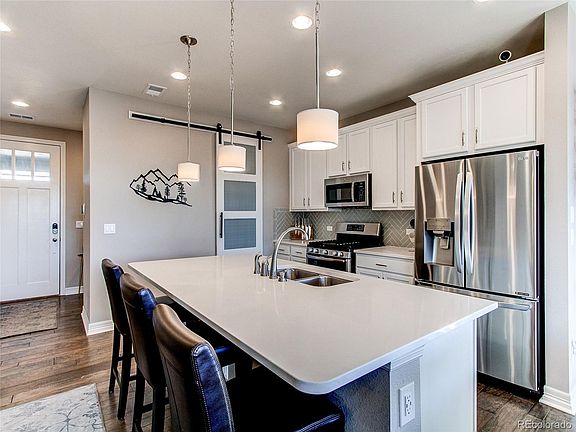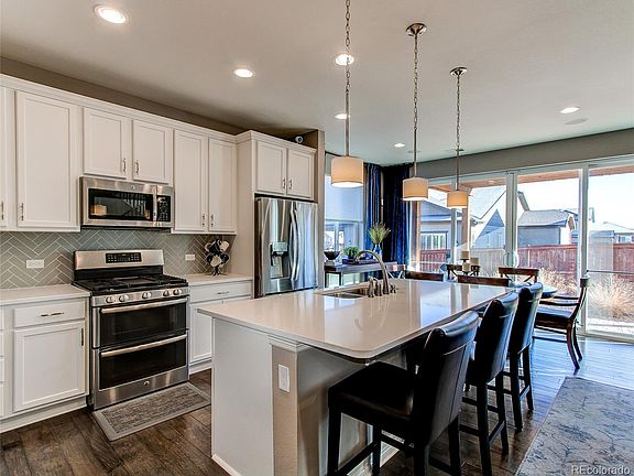 This two-story, huge corner lot, is immaculate and a former Richmond Coral model home that offers an abundance of natural light, one of the largest lots in the neighborhood and endless upgrades! The main level features beautiful hardwood floors throughout with a modern gas fireplace, complete with floor to ceiling tile. The kitchen is a chef's dream with a custom pantry barn door, quartz countertops, stylish tile backsplash, full stainless steel gas appliances, an oversized island, 42" with crown molding, and an eat-in-kitchen area. Upstairs has a cozy loft space perfect for a home office or bonus TV living area, a spacious master suite with a walk-in closet, and a large shower with subway tile design, dual vanity sinks, and quartz counters. Down the hall are two additional bedrooms, a full bathroom and convenient laundry room with cabinets for extra storage. If you like to entertain you will enjoy the professionally landscaped backyard with a paver patio, large pergola, shrubs, plants, boulders, and a full sprinkler system (front and backyards). Residents have access to all of the Traditions master plan amenities, including a clubhouse with a pool, as well as close proximity to local parks and walking trails! A short distance to E-470 and I-70, DIA, schools, parks and Southlands shopping area with tons of retail and restaurant options. This is a MUST see!
