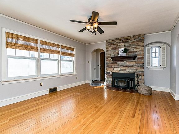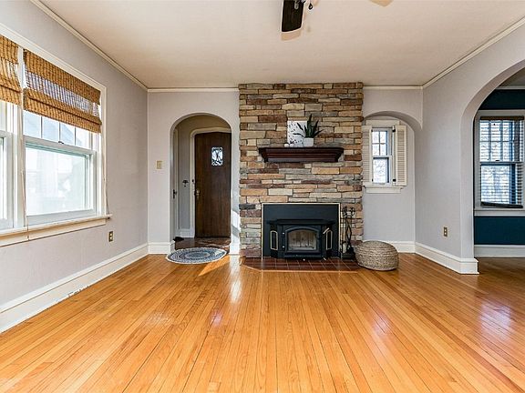 Charming 1.75 story home ready for you to move right in. Cozy up next to the built in stone fireplace and take in the arches and character of this beauty. Wood floors on main level, including through to the two bedrooms. Formal dining room features lots of large windows to let in the natural light. Wooden blinds stay. Upstairs is airy and bright, with built in storage space and desk or craft table. Plenty of space in both upstairs rooms. Downstairs in the unfinished basement, there is storage galore. Out in the backyard, the patio area with pergola is the perfect place to take in the spring and summer perennials that are abundant in this fairytale like yard. Extra parking space out front and beside existing 1 stall garage in back.