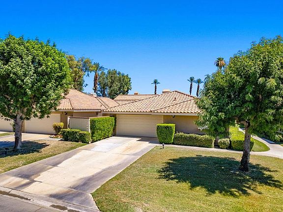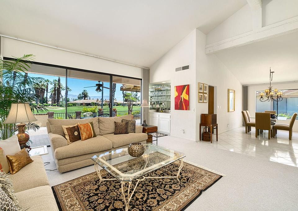 This rarely available 3000 Max plan is . Ideal place for a primary home or vacation getaway. Elevated on the South course at the 6th hole, the three-bedroom floor plan features three en-suite baths plus a separate powder room for your guests. The third bedroom is large with a converted atrium with two large skylights, it's a great space for overflow guests. A dedicated laundry room and attached garaged with access from inside supply ample storage. Neutral colors, vaulted ceilings, along with the Stylish Wet Bar and custom niches add to the home's warmth and functionality. Enjoy impressive sunsets while entertaining guests on the expansive back patio which includes easy access to pool and spa nearby. Connect w/the community, meet new people and build lasting relationships. Members are the heart and soul of the club. Specialty dining events, holiday celebrations, family fun days etc. In addition: 14 lighted tennis courts, 20 pickleball and1 bocce ball court, 37 swimming pools and spas, plus a remodeled fitness center. An affordable opportunity to enjoy the relaxed desert lifestyle. Furnishings included per seller's inventory. Act fast, you don't want to miss this one!