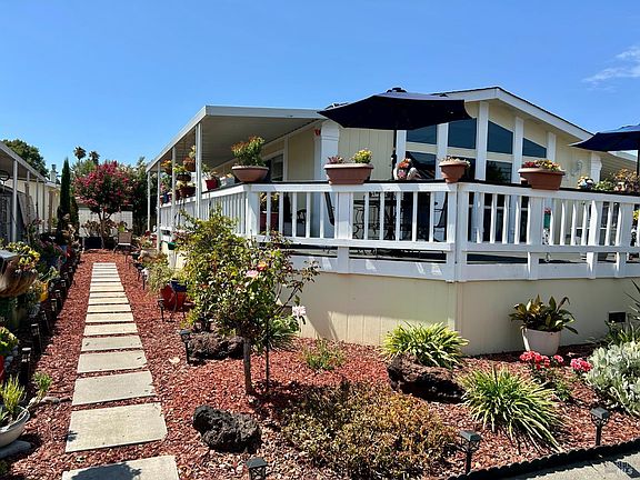 Welcome to popular SUN Community! Light and bright manufactured home with gorgeous freshly painted deck to enjoy mountain views, as well as beautifully landscaped yards. Living room has EV installed tint on large array of windows to enjoy the views from the inside too! New AC unit, water heater and stove/hood. New paint on exterior and most of interior as well. Earthquake braced and two car carport with guest on-street parking. Park has two pools, bocci, mini golf, and lots of other activities too numerous to name! The heart of Napa Valley living at an affordable price!