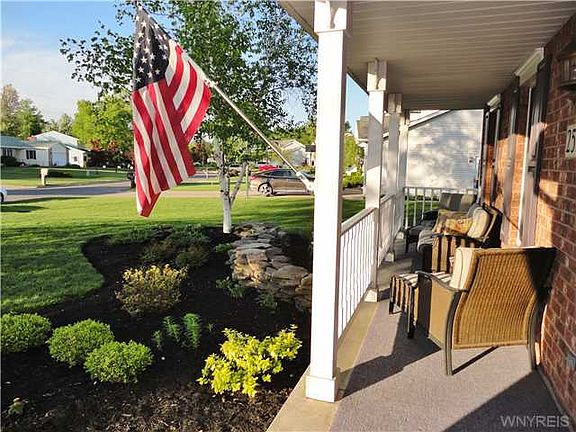 Impeccable, comfortable & inviting-Updated throughout. Warm wooden kitchen cabinetry,granite counters, island, SS appliances, ceramic flr & sunny eating area has sliding drs to patio. Open fam rm w/beamed cathedral ceil, WBFP & roundtop windows. Entertain in the din/liv rms or French doors for quiet space. Convenient 2nd fl laundry. Remodeled main & master(Corian shower & vanity) baths. Newer flooring,6 panel drs,WI closets,central air. Bsmt rec rm, gls blk wind, HE furnace 2015. Beautiful landscaping, covered frt porch, fenced bk yd, unilock patio w Sunsetter awning! Showings start Tues 5/26