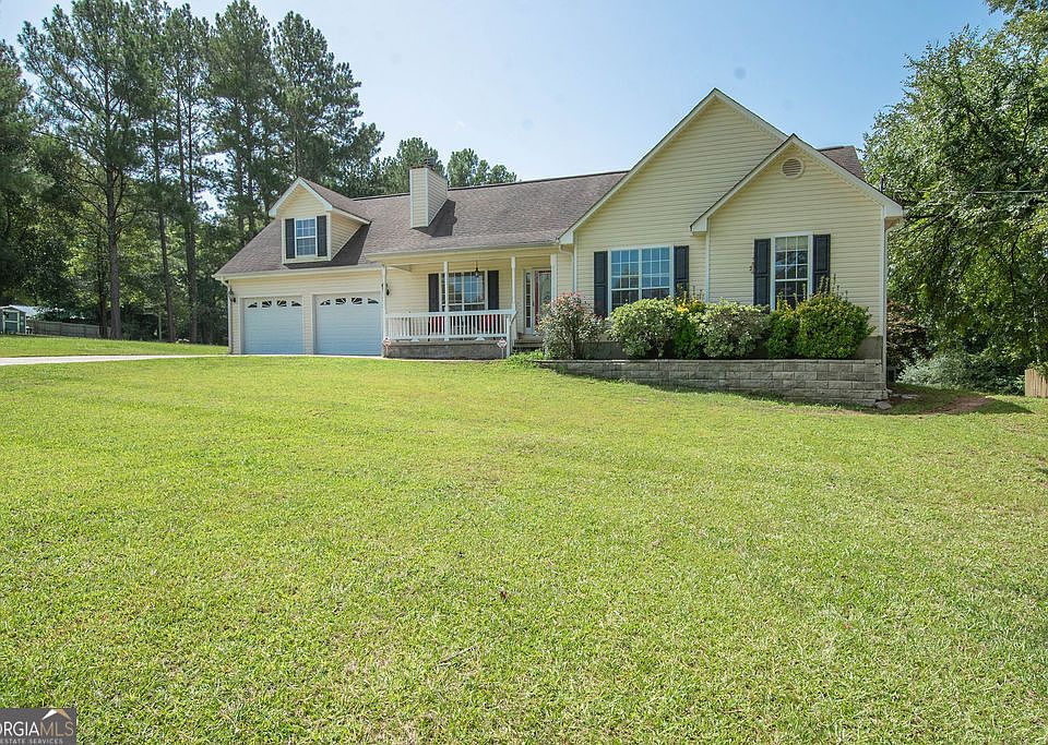 SOLD before Run. This updated ranch-style residence features 3 spacious bedrooms and gorgeous hardwood floors throughout, with tile in the kitchen and breakfast room. The kitchen has a porcelain farmhouse sink, subway tile backsplash, stainless steel appliances, and quartz countertops. Barn doors lead to the inviting family room, which showcases cathedral ceilings. The primary bedroom is a true retreat, with a tray ceiling and an en-suite bath with a double vanity, a tile shower, a soaking tub, and granite counters. Two secondary bedrooms share a full bath. Above the 2-car garage there is a bonus room where the third full bath is located. Outdoor living includes an above-ground pool, a covered patio perfect for game day, a TV, a separate dining area, and a sun deck. The private backyard, lined with trees, provides a serene and secluded oasis.