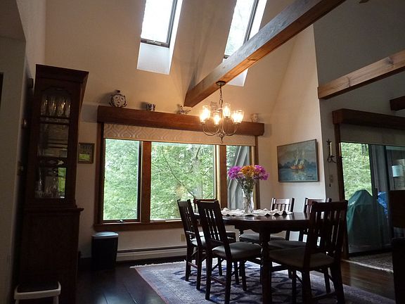 Perfect for residence or vacation property, well maintained home on 5 acres w/mtn views. Split floor plan w/Mbdrm en-suite, open & covered decks for mtn viewing, easy access on town maintained road. Furn. New roof & sidewall in 2013, both chimneys refurbished 2013, new heat system, custom built bookcases in library/study & liv rm, cathedral ceilings, exterior re-stained 2013, new water pump in 2013, int painted 2014, stone fire place in liv rm & "Hearthstone" gas-log stove in library/study & access to covered deck, open 22'x8' deck. Sellers offer $1,500 closing cost credit to buyers at closing. Situated close to three ski areas & only 20 min to Middlebury College Bread Loaf Campuses. Nearby major golf courses, hike the Long Trail or kayake the White River. Great Hawk's private tot playground, tennis courts & swimming pond a short stroll away.