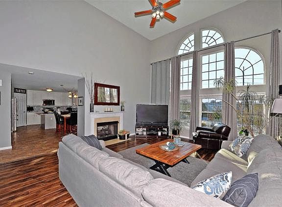 Beautifully updated 4 bedrm, 3.5 bath 1.5 story home just minutes from elementary, shopping & Hwys! 20' ceiling Great Rm features Palladian window overlooking huge backyard + DBL sided gas FP! Kitchen updated to include 42 white painted cabinets, granite counter tops, SS undermt sink & tiled back splash! Newer SS appl- smooth top stove, DBL oven, DW, micro & French door refrig! Wlk-in pantry! Updated Laminate flooring in entry, GR, office & mst bed. Heated tiled flring in kit, bkfst rm, mst bath, powder rm & MFL! MAIN FLR VAULTED MST SUITE w/soaking cornor tub, sep shower & DBL bowl vanity + wlk-in closet! Exposed wood steps leads to 2nd flr w/3 bedrms, one w/vaulted ceiling & arch top window! Lower level is perfect for entertaining w/custom wet bar area w/tiled flring, carpeted theater rm + bonus rm! Lots of natural lighting w/2 Lg windows + slider wlk out to patio! Full bath w/custom tile work! Spacious deck w/Pergula! HVAC 1 yr! Arch roof 2012! All windows tinted w/trans warranty!