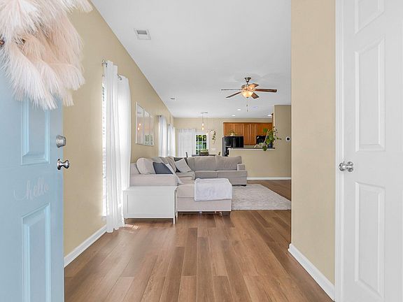 Beautiful two story home with primary bedroom downstairs. AC & hot water heater are less than 3 years old. Huge family room for kicking back & watching TV. 42'' kitchen cabinets with built in microwave for convenience. Pantry has room for all your cooking items. Oversized primary bedroom overlooks the backyard has extra large closet. Primary bath offers dual sink vanity. 2 large light filled rooms upstairs separated by a bathroom. Upstairs has large storage closet for your holiday decorations. Ceiling fans in all bedrooms. Backyard backs to woods for privacy.