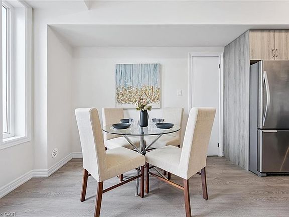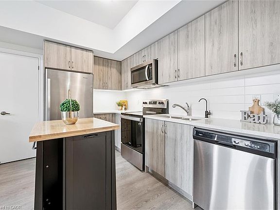 Welcome to 252 Law Drive, a modern, ground-level stacked townhome offering easy, stair-free living in one of Guelph’s most convenient and community-focused neighbourhoods! Whether you're a first-time buyer, downsizer or professional seeking a condo alternative with a private entrance, attached garage and added privacy, this home delivers on every front. Unlike most condos, you’ll enjoy 2 full parking spaces - one in the garage & one in the driveway. A rare & valuable bonus in this price point! Step into the stylish, open-concept kitchen featuring sleek modern cabinetry, quartz countertops, subway tile backsplash & stainless steel appliances. The layout flows effortlessly into the bright dining space & spacious living room with laminate flooring and a large picture window that floods the home with natural light. The bedroom features an expansive window, while the 4-piece bathroom offers quartz counters and a beautifully tiled shower/tub combo. This home offers direct access from your garage, in-suite laundry, and even your own outdoor terrace! Low condo fees help make this home an incredibly affordable option. Located just steps from Hammill Park, this is a dream for pet owners & nature lovers. Plus, you’re minutes from shopping, trails & major commuter routes. With a great location, modern finishes and a layout that fits your lifestyle - this home is truly the best of simplified living without sacrificing space, style or storage!