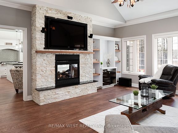 This Custom Built Bungaloft Has Over 4,300 Square Feet Of Total Living Space! The Pride of Ownership & Attention to Detail Throughout The Entire Home & Property Makes This Home A Must See! The Main Floor Is Just Stunning with Hand Stained Hardwood Flooring & Plenty of Natural Light Throughout! Open Concept Kitchen / Dining Area Boasts Upgraded Solid Wood Cabinets, New LG Fridge, Double Oven, Gas Stove Top, Wine Fridge, Plenty of Cupboard Space, Centre Island, Sitting Area With 2 Way Gas Fireplace, Overlooks & Has Walk-Out To Back Patio Entertaining Area. Speaking of ... Get Ready To Host Your Summer Parties! With A Sheltered BBQ Area, 2 Gas Lines, Screened In Gazebo with Powered Light & Ceiling Fan ($30,000 Upgrade at Time of Purchase), Multiple Sitting Areas, Fence Line Lighting, Rough-In Electrical for Future Hot Tub, Fire Pit with Wood Storage Area & Views of the Pond Behind The Property. Living Room has View of Patio Entertaining Area, Cathedral Ceilings, 2 Way Gas Fireplace & Surround Sound System which Works on the Back Patio As Well! Main Floor Primary Bedroom has Spa Like 5 Pc Ensuite with Soaker Tub, Walk-In Shower, Double Sinks & Large Walk-In Closet. Main Floor Has Access To 4 Car Garage with 2 Separate Areas Both Insulated- 2 Ten Ft Doors & 2 Eight Ft Doors(Garage with 2 Eight Ft Doors is Heated & Features Crown Moulding & Exit to the Backyard Area) . Office Area, 2 Pc Bath & Laundry Room Area Complete Main Level. 3 Other Bedrooms Located on Upper Level Along with a 5 Pc Bath. Even When The Colder Weather Is Here ... This is STILL the Place to Entertain .... Have You Seen The Lower Level ?! Games Room Area, Wet Bar Area, TV/Movie Area with Surround Sound, Gym Area, 3 Pc Bath, Gas Fireplace & Make Sure You Check Out The Custom Lighting! Located in the Heart of Erin & Within Walking Distance to High School, Boutique Shops, Restaurants, Tim Hortons, Convenience Store, Pharmacy, Parks, Walking Trails & More! Generac Generator-Powers Most of the Home.
