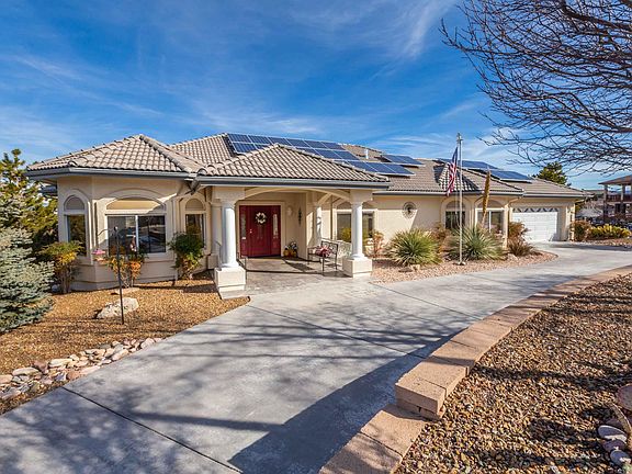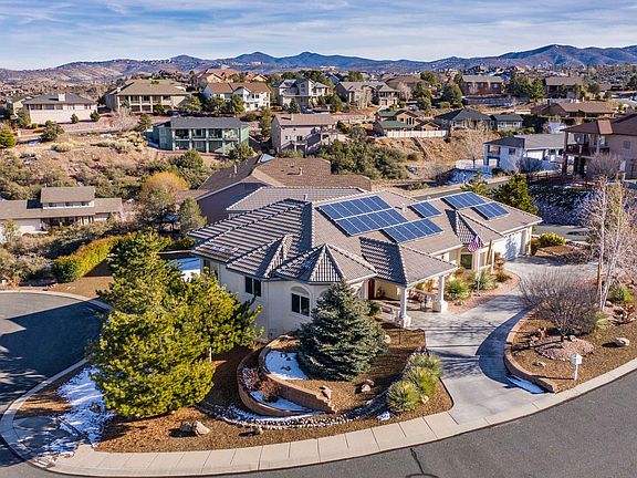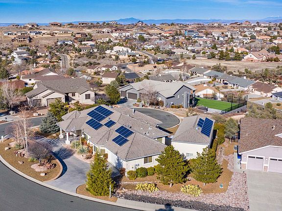 YOU CAN HAVE IT ALL! The appeal starts at the curb w/attractive landscaping, circular drive & never ends on this Prescott Highlands [no HOA] 1 story customized home completed in 2004 [2253sf 3 bdr, 2 bath Central Living Plan w/Dining + Nook] - stunning Dells & Mingus Mountain VIEWS - detached RV garage [18x46 w/12x14 overhead door & RV hookups]. Prepaid SUNRUN SOLAR [36 panel-20 year system] minimizes utility costs. Spacious engineered Deck + private back Courtyard [ideal for your furry friends], cul-de-sac location. Cook's delight Kitchen w/lots of granite counter space, attractive cabinetry, island w/cooktop, wall oven + microwave, snack bar w/pendants,, pantry & adjacent nook. Designer tile & luxury vinyl planking w/carpet in Bedrooms, inviting interior color palette, bay windows,